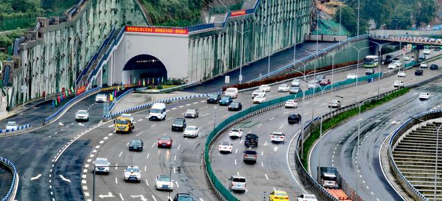 ▲5月15日上午,一辆小车(右)正从南岸区烟雨路至内环段上行隧道驶入,标志着江南立交改造工程前期实施部分(即一期工程)全面完成