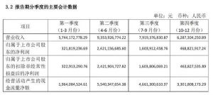 一二三四季度收入分别为57.44亿元、93.54亿元、79.19亿元、62.87亿元,归属上市股东净利润分别为3.22亿元、2.42亿元、16.04亿元、46.88亿元。