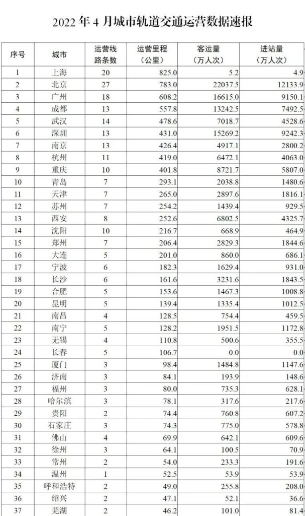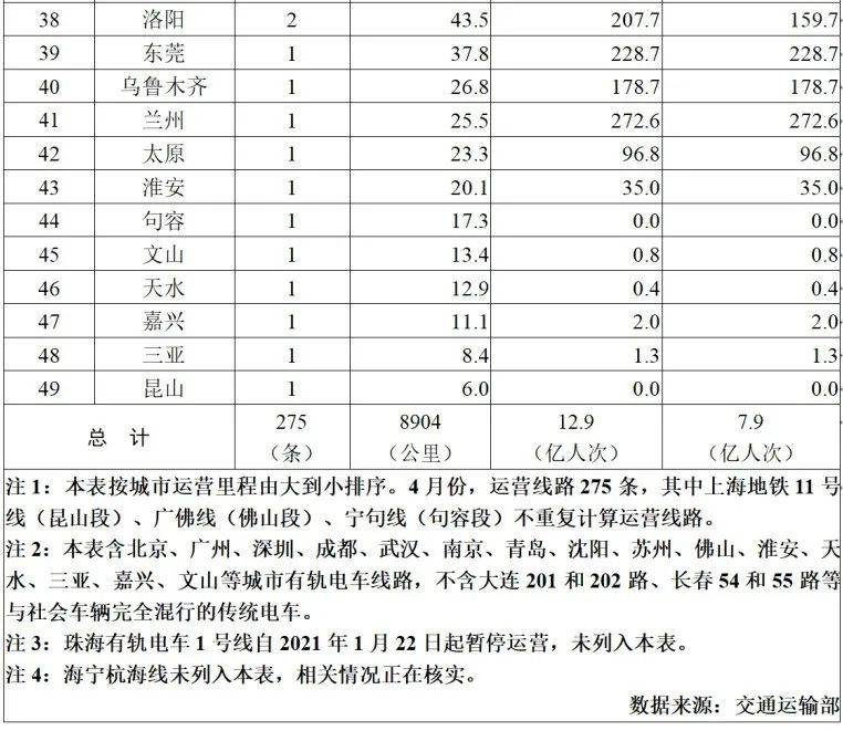 城市交通网从交通运输部获悉,2022年4月,31个省(自治区、直辖市)和新疆生产建设兵团共有51个城市开通运营城市轨道交通线路275条,运营里程8904公里,实际开行列车240万列次,完成客运量12.9亿人次,进站量7.9亿人次。4月份,新增运营线路2条、运营区段2个,分别为绍兴市轨道交通1号线主线、福州市轨道交通5号线一期首通段,以及杭州市轨道交通7号线江北段和9号线南段,新增运营里程66.3公里。4月份,51个城市完成客运量环比减少3.1亿人次、降低19.4%,同比去年4月减少9.0亿人次、下降41.1%。