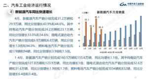 1-4月,新能源汽车产销分别完成160.5万辆和155.6万辆,同比均增长1.1倍。其中纯电动汽车产销分别完成127.8万辆和123.9万辆,同比均增长1倍;插电式混合动力汽车产销分别完成32.6万辆和316万辆,同比分别增长1.9倍和1.7倍;燃料电池汽车产销分别完成1034辆和832辆,同比分别增长6.4倍和3.4倍。