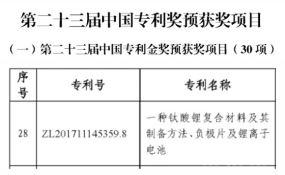 日前,由国家知识产权局组织主办的第二十三届中国专利奖评审结果公示,格力钛新能源“一种钛酸锂复合材料及其制备方法、负极片及锂离子电池”发明专利,成功入选中国专利奖金奖名单,摘得锂电池行业内的发明专利“首金”,也是新能源行业唯一获得金奖的锂电池产品专利。