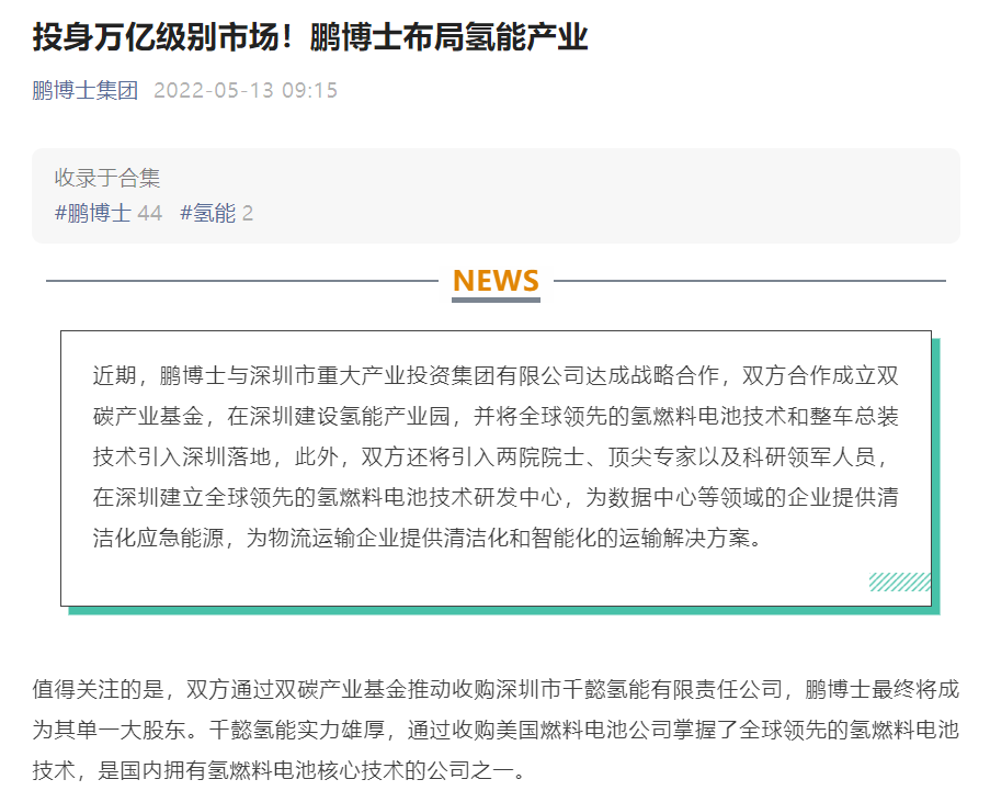 值得关注的是,双方通过双碳产业基金推动收购深圳市千懿氢能有限责任公司,鹏博士最终将成为其单一大股东。千懿氢能实力雄厚,通过收购美国燃料电池公司掌握了全球领先的氢燃料电池技术,是国内拥有氢燃料电池核心技术的公司之一。