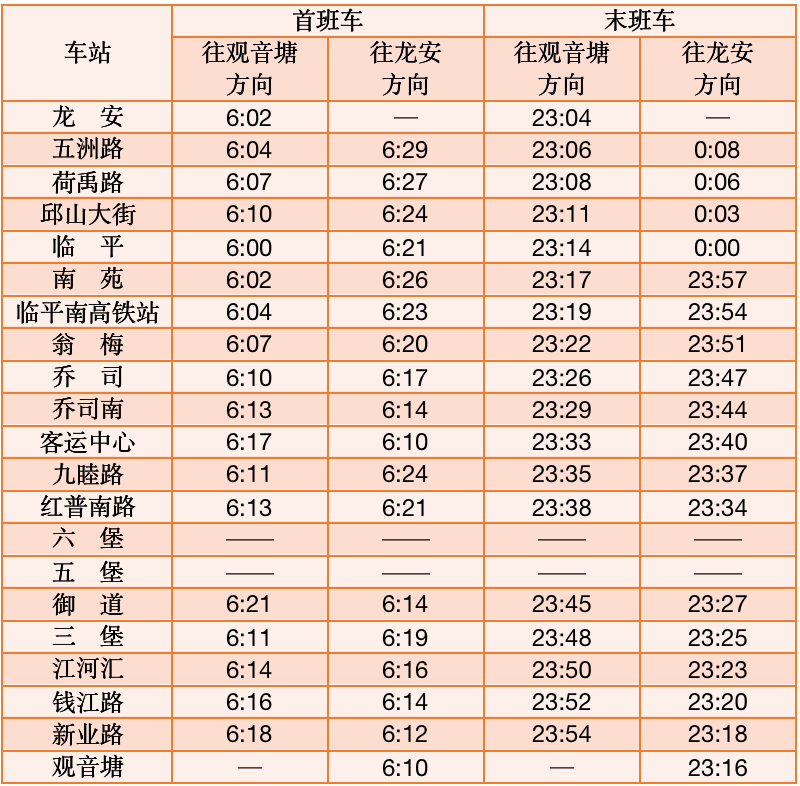 此次通车的南段工程全长约12公里,设10座车站,分别为观音塘站、新业路站、钱江路站、江河汇站、三堡站、御道站、五堡站、六堡站、红普南路站、九睦路站,其中五堡站、六堡站暂缓开通。