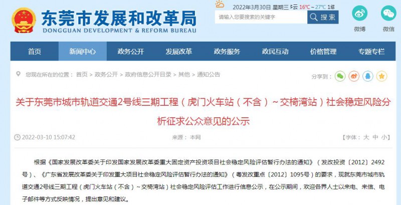 近日,东莞市发展和改革局官网发布《关于东莞市城市轨道交通2号线三期工程(虎门火车站(不含)~交椅湾站)社会稳定风险分析征求公众意见的公示》。