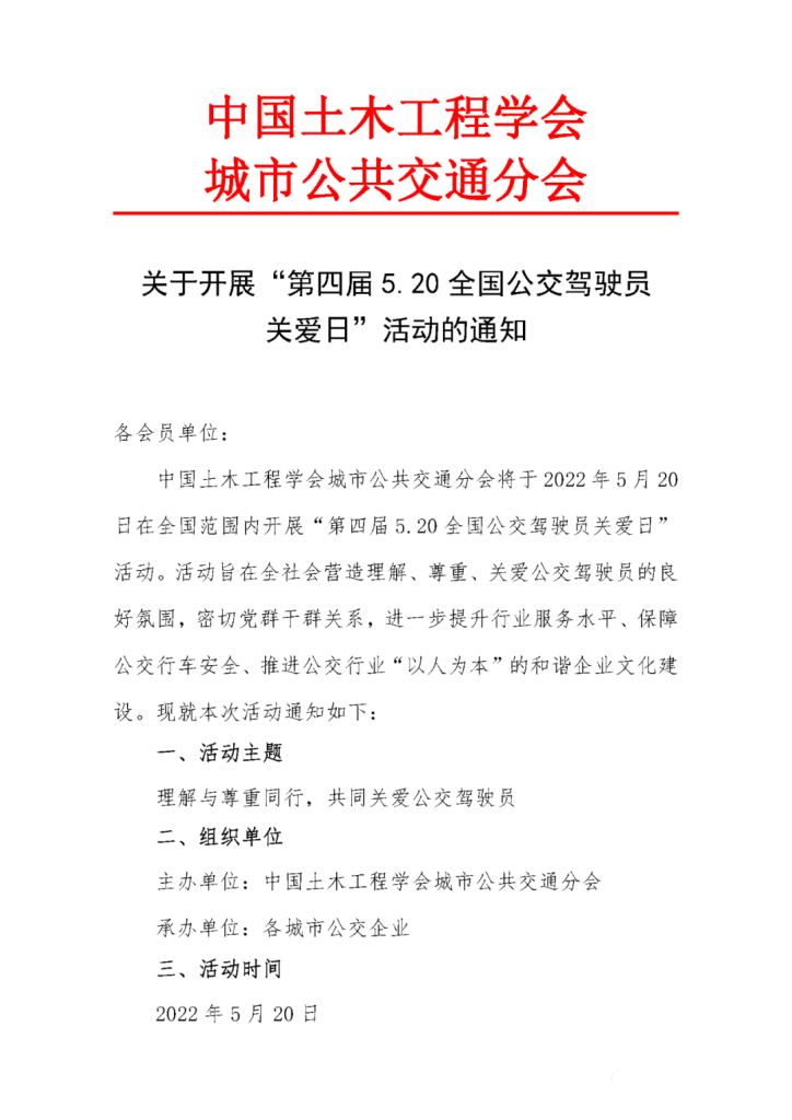 中国土木工程学会城市公共交通分会将于2022年5月20日在全国范围内开展“第四届5.20全国公交驾驶员关爱日”活动。活动旨在全社会营造理解、尊重、关爱公交驾驶员的良好氛围,密切党群干群关系,进一步提升行业服务水平、保障公交行车安全、推进公交行业“以人为本”的和谐企业文化建设。现就本次活动通知如下:
