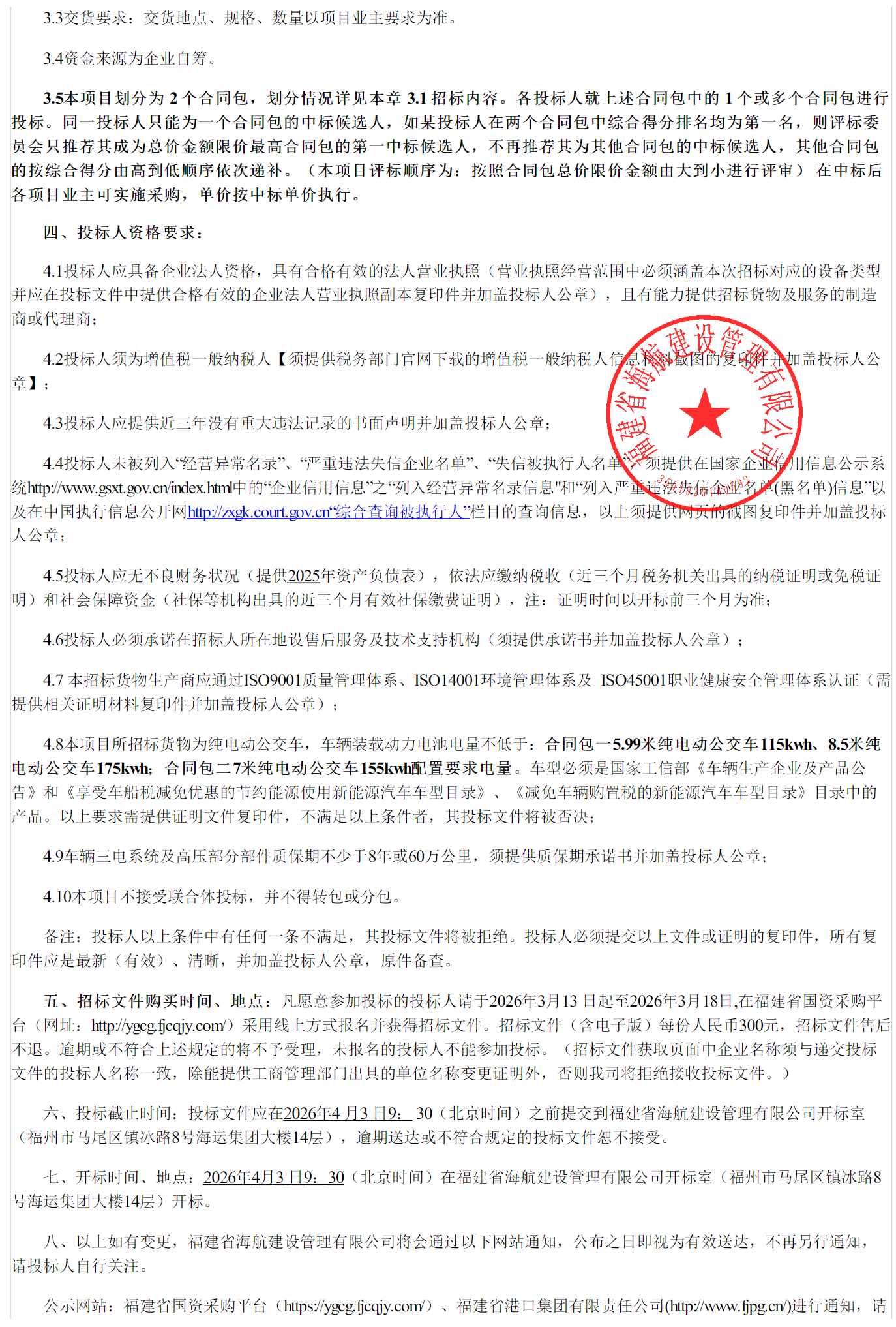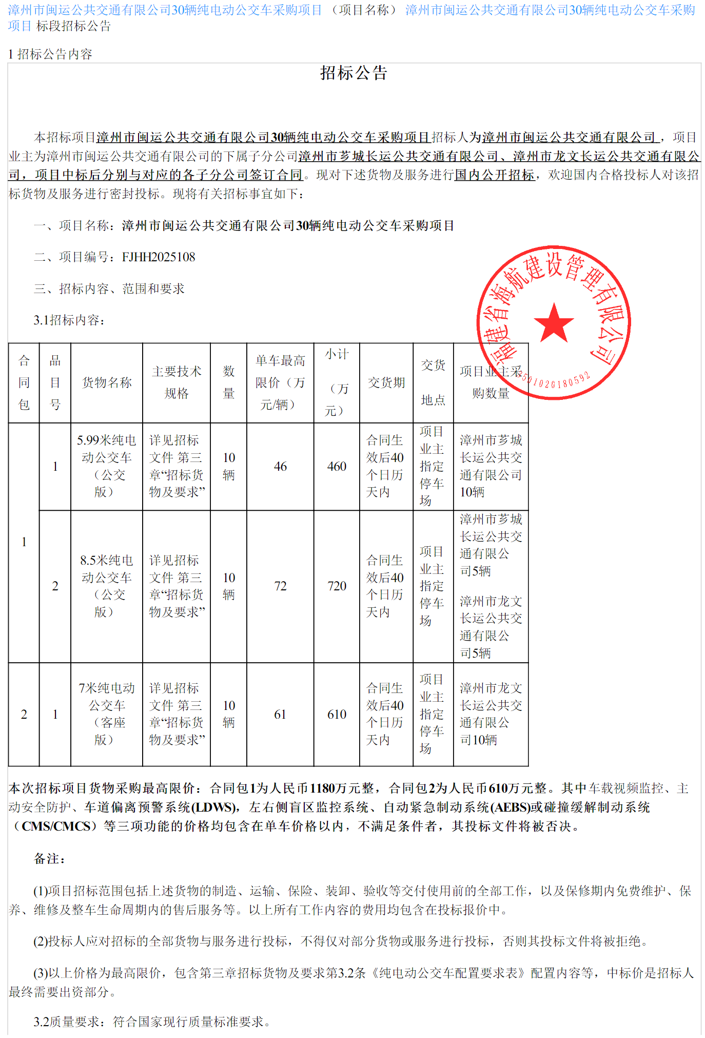招标丨漳州市闽运公共交通有限公司30辆纯电动公交车采购项目招标公告