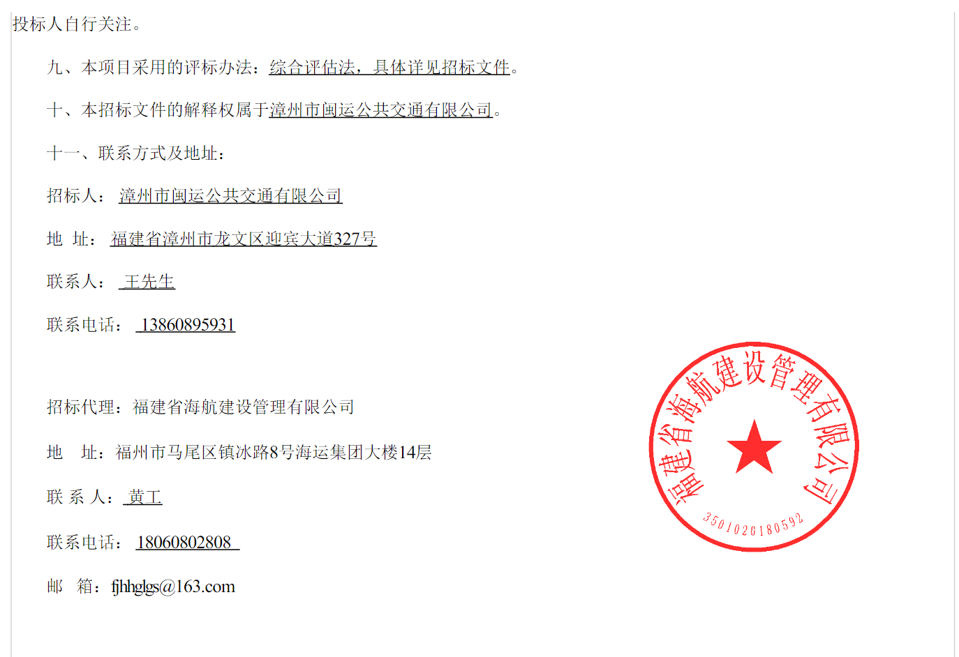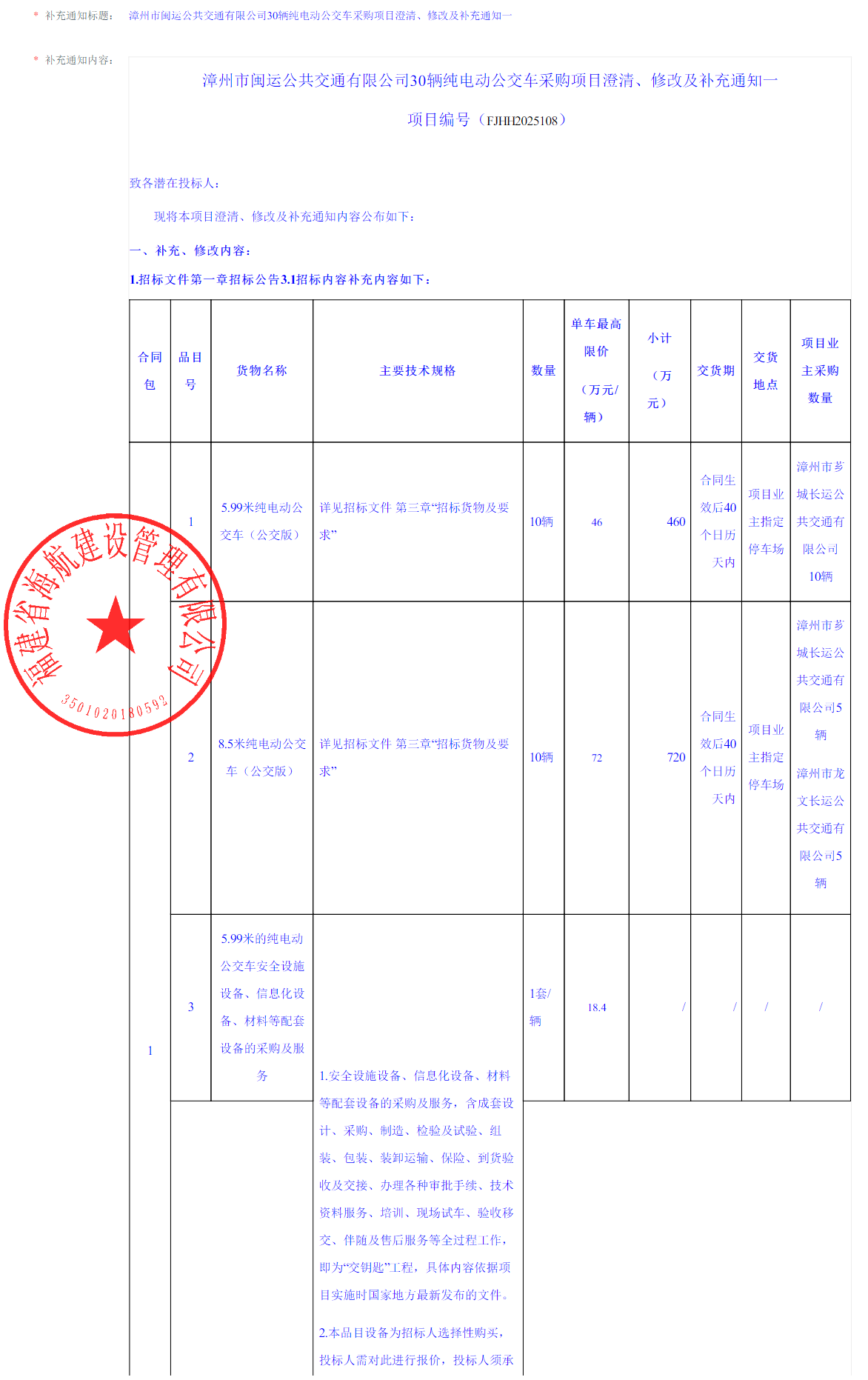 漳州市闽运公共交通有限公司30辆纯电动公交车采购项目澄清、修改及补充通知一