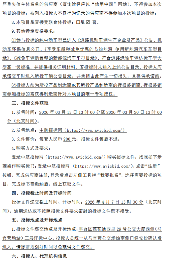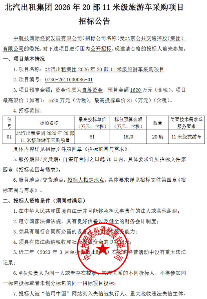 招标丨北京市北汽出租集团2026年20辆11米级旅游车采购项目招标公告