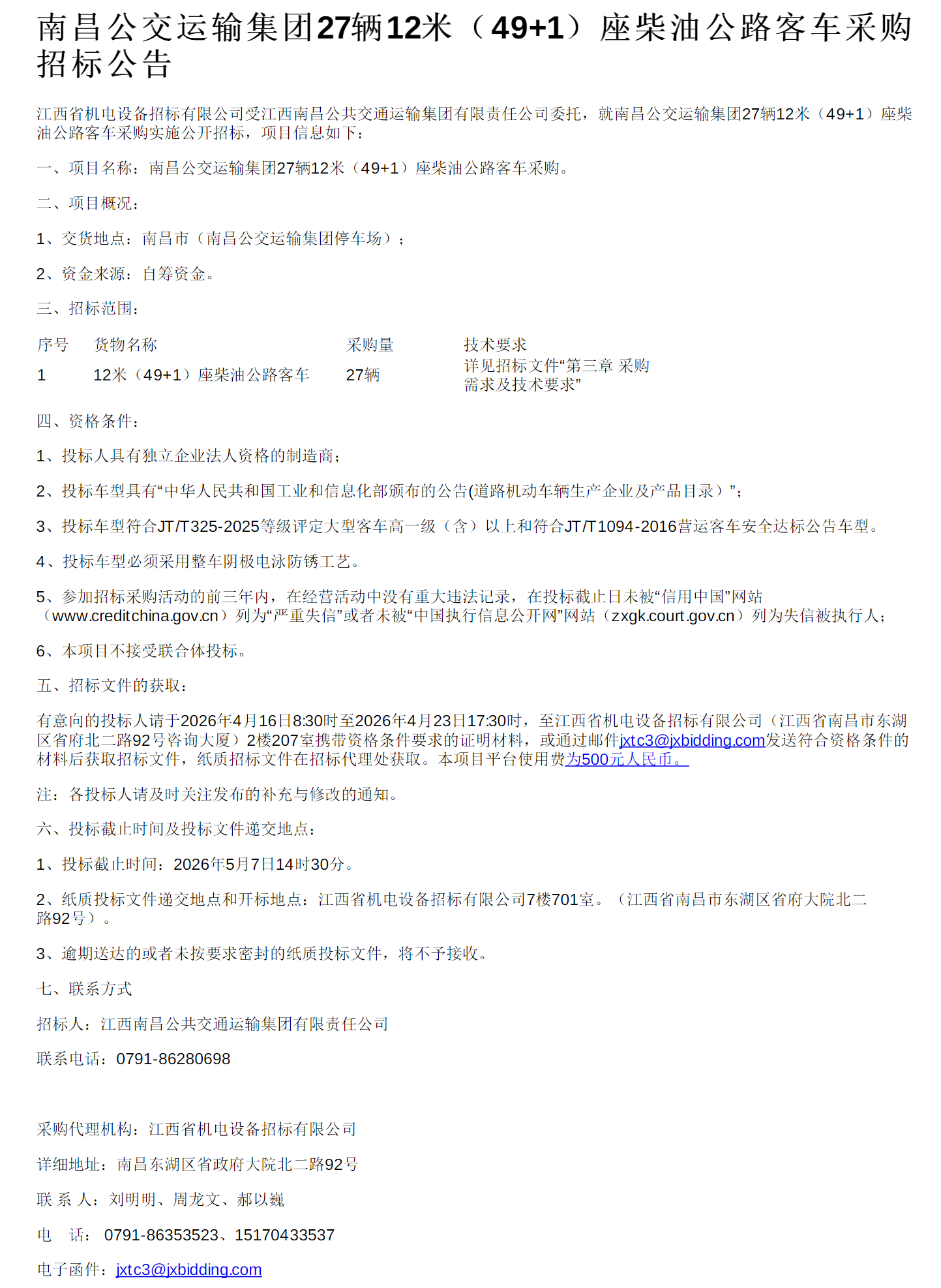 日前,南昌公交运输集团27辆12米(49+1)座柴油公路客车采购项目招标公告发布,公告详情如下: