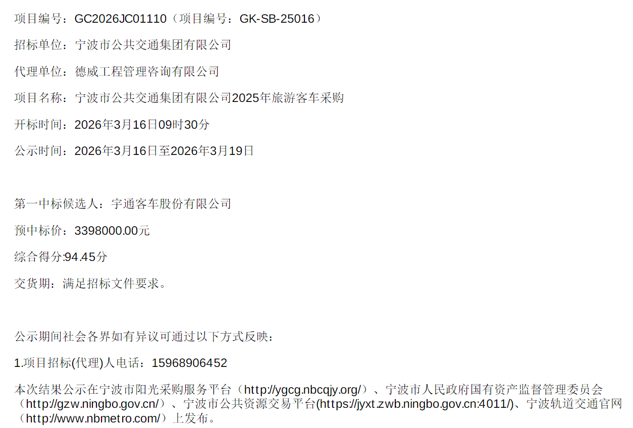 中标丨宁波市公共交通集团有限公司2025年旅游客车采购中标候选公示